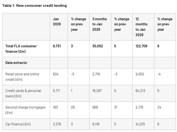 New figures released by the Finance & Leasing Association (FLA) show that consumer finance new business grew by 3% in January 2026 compared with the same month in 2025. In the twelve months to January 2026, new business in this market was 6% higher than in 2024.