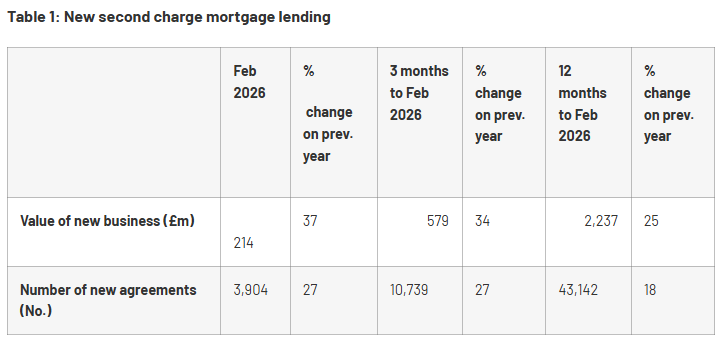 Second charge mortgage new business volumes grew by 27% in February 2026